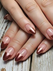 Translucent pink has a skin-like quality that makes nails feel personal. Rose gold sparkle blends naturally into that base, adding warmth without standing out too much.